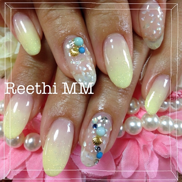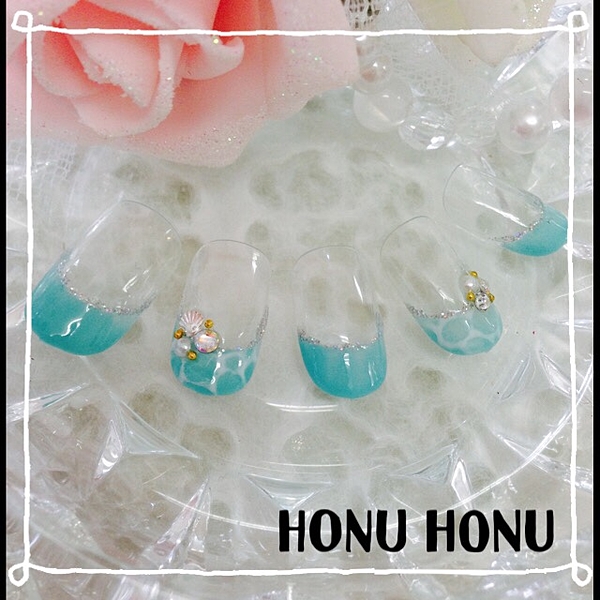 シェルを詰めこんで、キラキラが華やかだけど上品な夏ネイルです♪
