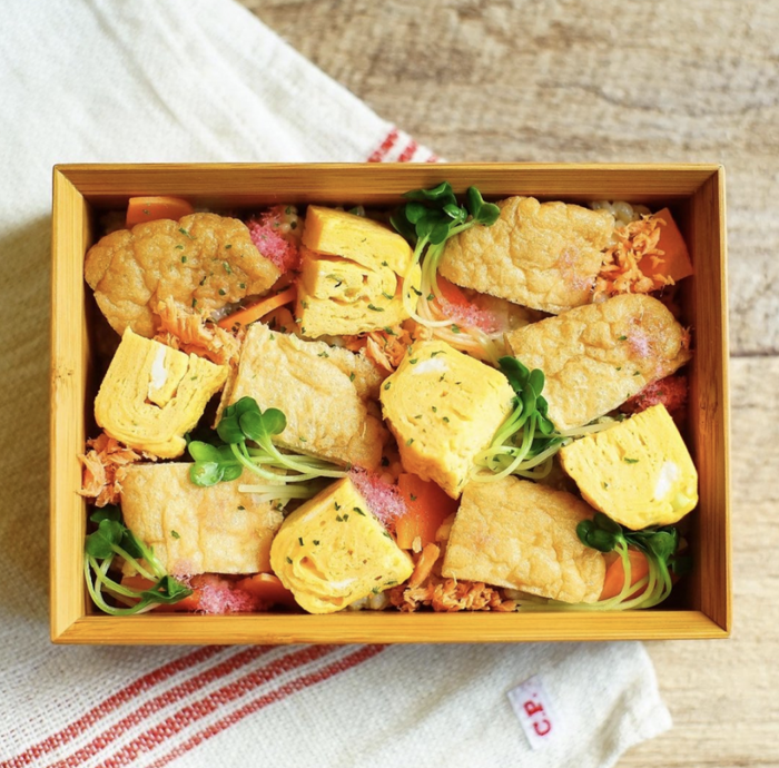 前日の夕ご飯に稲荷を作り、残った酢飯に多めに作ったきつねをのせてお弁当にしています。何でもない日に、華やかなこんなお弁当もたまにはいいですよね!