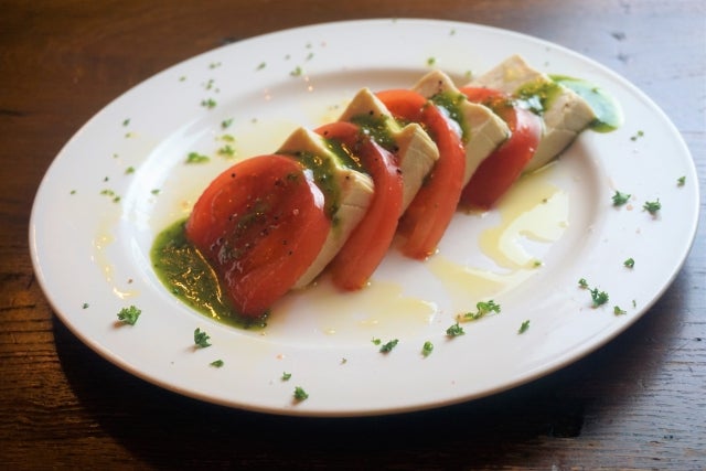 トマトをはさんでオリーブオイルをかけてカプレーゼ風でどうぞ