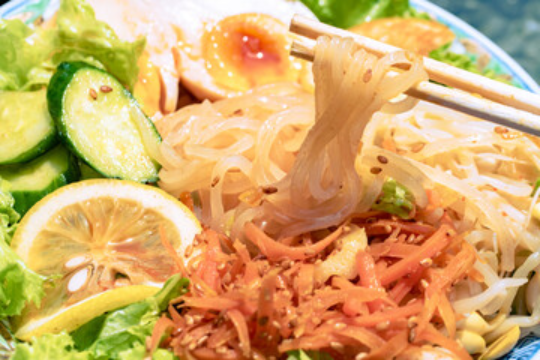 冷麺の麺をこんにゃく麺に置き換えて食べてみましょう。こんにゃく麺とはこんにゃくを原料にした麺で、1食あたりのカロリーが約20kcalで低カロリーなのが魅力です。