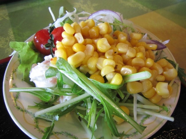 レタス、きゅうり、トマトにとうもろこしをおいしく混ぜて器に盛り付けて完成です。
