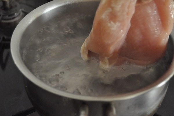 1、鶏むね肉が程よく入る大きさの鍋に水、酒、塩を入れて強火にかける。煮たったら鶏むね肉を入れ、再び煮たったら火を止めて鍋に蓋をしてそのまま冷ます。