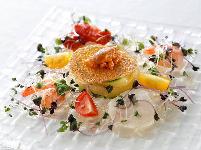 パルメザンチーズのチップスの上には北海道産の新鮮なウニ。その下に見えるのは、群馬県・嬬恋(つまごい)高原の無農薬のズッキーニに、風味豊かなトマトのムースを添えたもの。ちりばめられたハーブ類は、福岡県の『久保田農園』から取り寄せたもの。一つひとつ、丁寧な仕事ぶりが伝わってくる一皿だ。