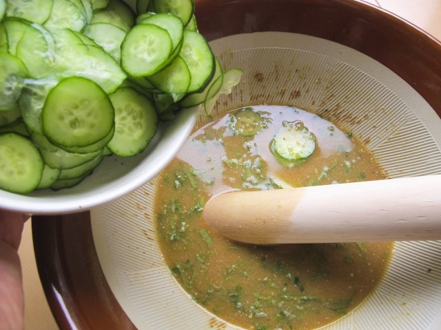 以下の具材の《冷や汁や冷たいスープ》+小口切り冷凍オクラもおいしいですよ。