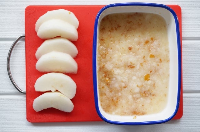 1個分のカットした梨を砂糖とオリーブオイルにつけます