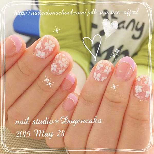 フレンチネイルを基本にしたデザインです。クリア部分に小花を描く事で、よりブライダルに合うネイルデザインとなっています。