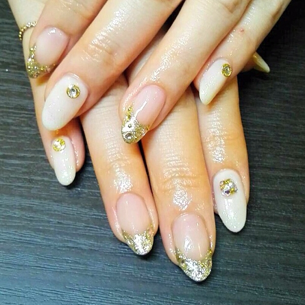 フレンチネイルのラインにストーンやラメを多く使用しています。