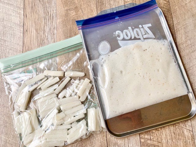 長いもはすりおろした状態で冷凍しておくと便利ですよ。金属バットなどにのせて、平らに薄くのばした状態で急速冷凍すれば、必要なだけポキポキ折って使えます。短冊切りは、なるべく重ならないようにフリーザーバッグに入れ空気を抜いて冷凍します。 また、短冊切りの長いもを保存する場合はピーラーで皮をむいたら、2~3分酢水にさらしておきましょう。このひと手間で、変色を防ぐことができます。キッチンペーパーで水気をふき取ってから、すりおろしたり短冊切りにしてください。