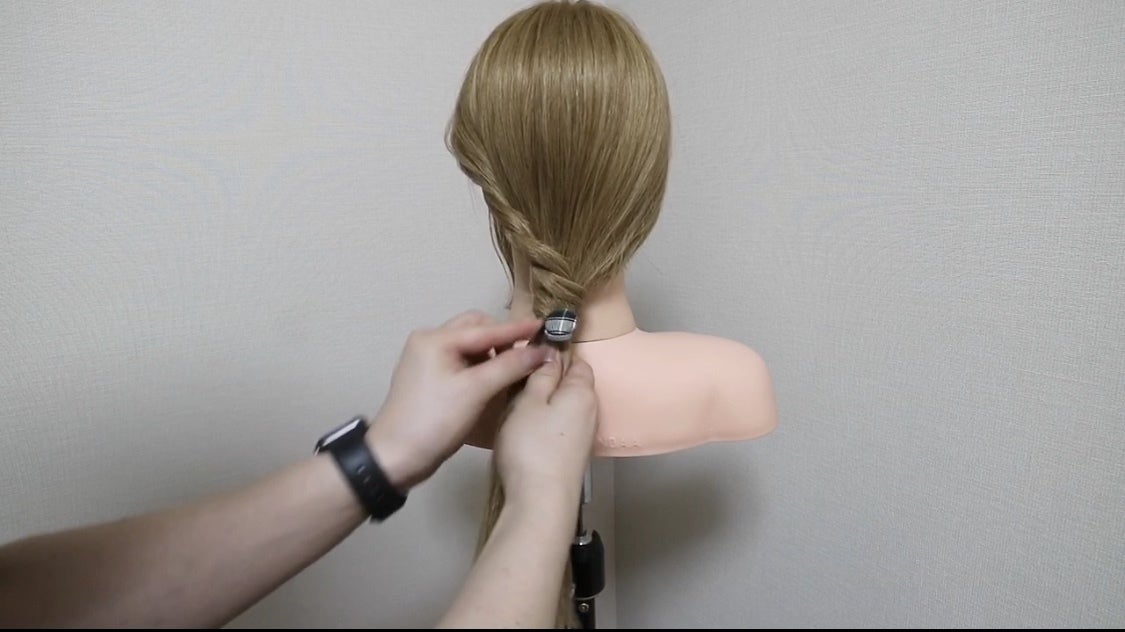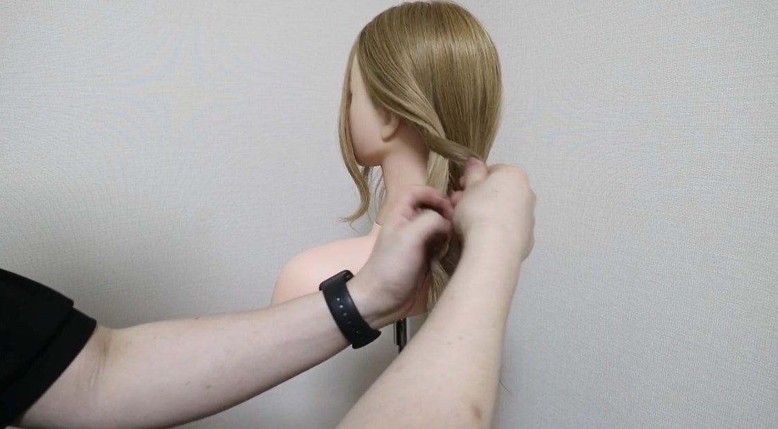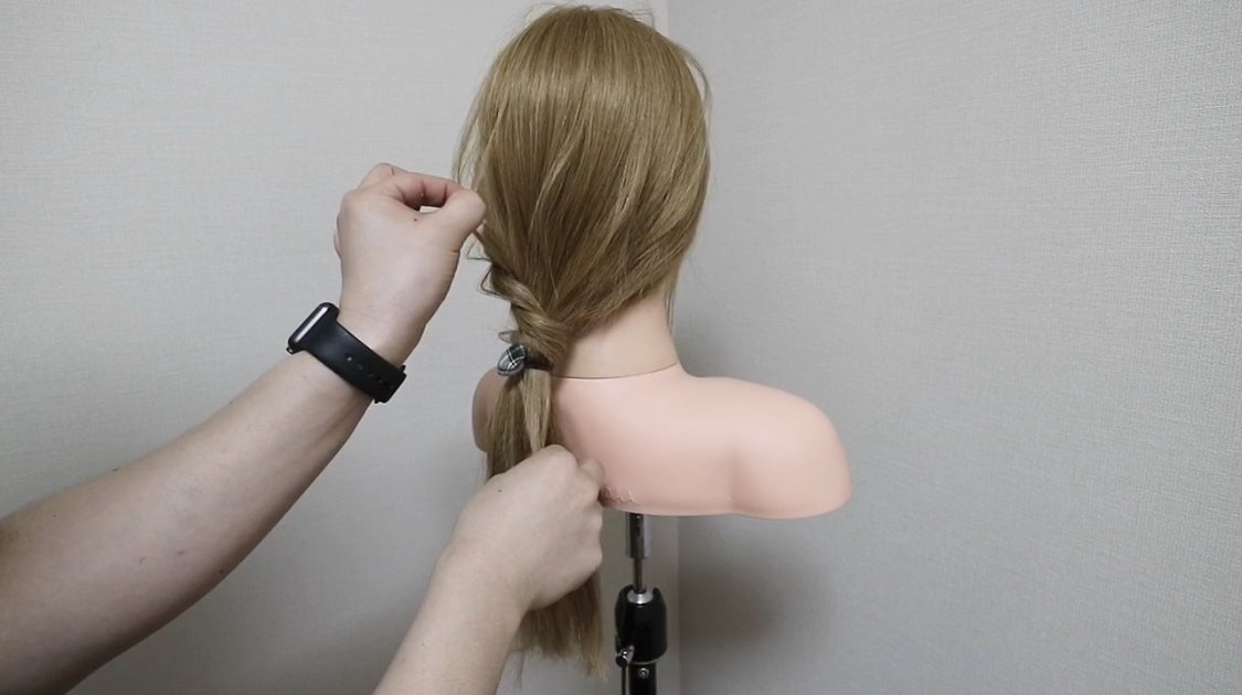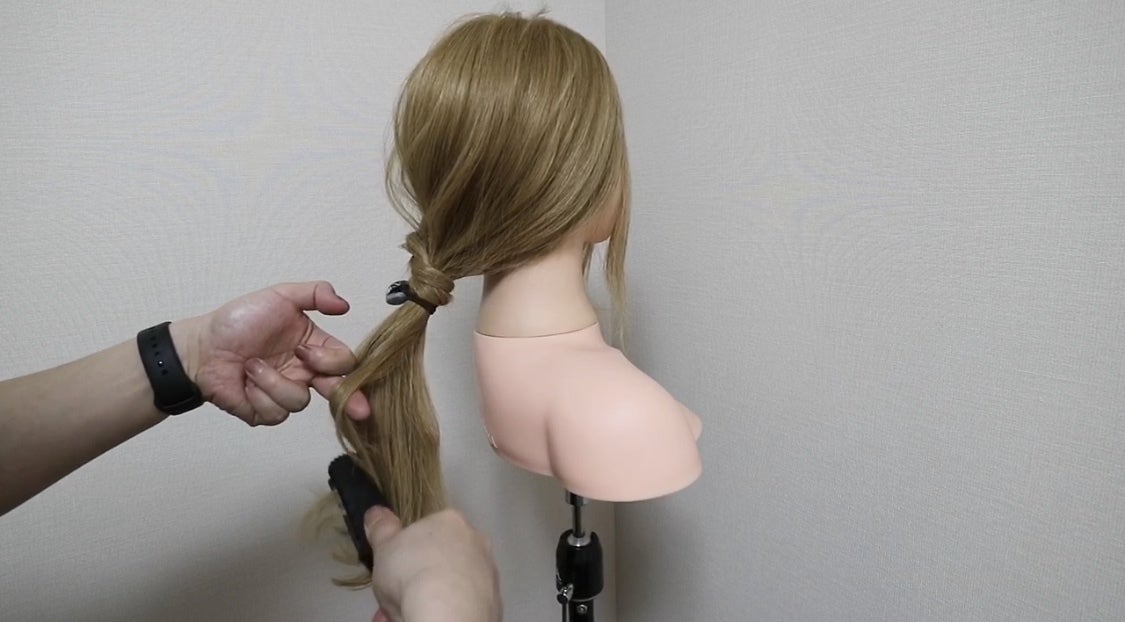 ③ 残しておいたサイドの髪をねじりながら、はじめに結んでおいた毛先に巻きつけてゴムで固定します。
