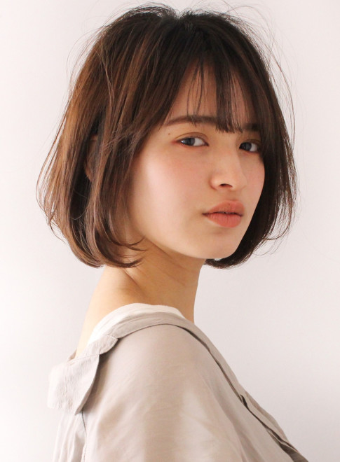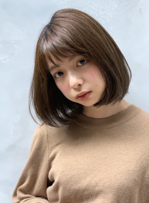 髪のツヤ感を引き立てる、ストレートベースのボブスタイルです。前髪は目の上ギリギリでカットし、サイドへ繋げることで小顔効果アップ。スタイリングが簡単なのも嬉しいポイントです。