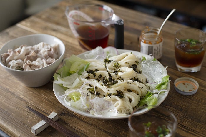 以上、我が家の「だるい日」ごはんでした。そうめんと冷しゃぶだけの食卓も、作り置きの副菜を1つ2つ加えたら、まあまあ立派に見えるはず。カミさんの前では言えませんが……、誰にでもある「だるい日」は、手軽で気楽に作れるもので食卓を埋めれば、それでいいんじゃないでしょうかね。