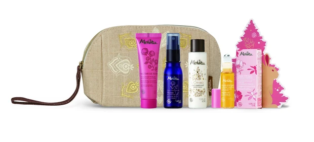 人気のビオオイル ローズ&アルガンタッチ オイルをメインに、ローズのミスト化粧水、ボディミルク、シャワージェルがセットになり、これ1つでメルヴィータのスキンケアからボディケアまで、トータルケアを堪能できる特別なホリデーキット。ナチュラルなデザインで使いやすい、オリジナルポーチがセットになって登場です。