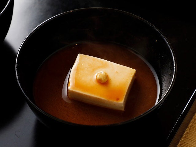 タイのすり身とヤマトイモで作ったしんじょうに角切りの生アワビを混ぜている。しんじょうのなめらかさ、アワビの弾力、エビのプリプリ感…、ごく淡い味付けの汁が、それぞれの素材の食感を絶妙に引き立てている。