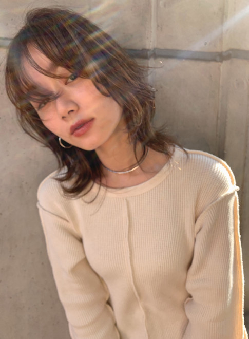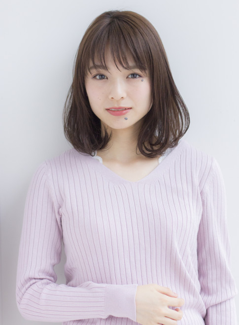 自然体な雰囲気が魅力のシンプルなミディアムです。毛先に低めのレイヤーを入れ、軽さと動きをプラス。目の上でカットした斜め前髪は目を大きく見せる効果も。アッシュ系カラーで透明感のある髪色に。