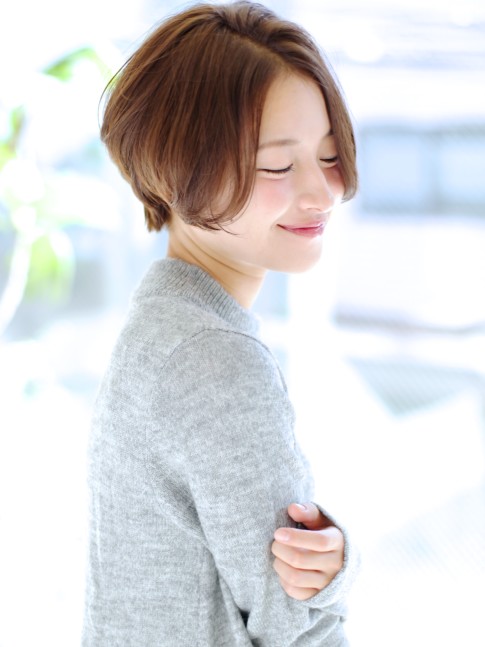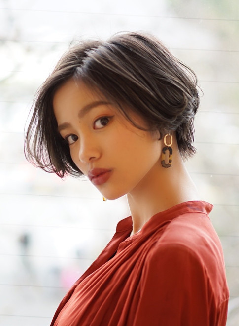 ふんわりとした柔らかなシルエットの前下がりショートボブです。短めのスタイルでも、女性らしい柔らかさが出るのは丸みのあるシルエットだからこそ。明るめのカラーが可愛さをプラスしていますね。