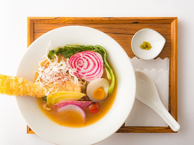 写真上の「おん齋麺」は季節の野菜と春雨湯葉巻き揚げをトッピングしたやさしい味わいの一品。自家製の柚子胡椒とともにいただく。