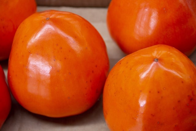 富有柿…甘柿の品種の一つで、丸みのある形と甘みが強く柔らかい果肉が特徴です。旬の時期は10月下旬~12月頃となります。発祥の地である岐阜県をはじめ、奈良県や福岡県など西日本を中心に生産されている品種です。