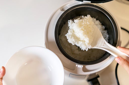 ごはんが炊けたら、しゃもじを使って上と下、中心と外側をよく混ぜ、ムラをなくします。炊きあがったごはんは、保温モードで熱を加え続けると徐々においしくなくなるので、なるべく食べきるのがおすすめです。食べきれないごはんは、ラップでくるみ、荒熱をとったあと、チャック付きの冷凍保存袋に入れ冷凍庫で保存してください。