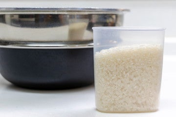 まずは米を計量します。子どもに米の計量カップを渡し、「このカップでお米をはかるよ」、「このカップ1杯で1合。お茶碗2杯分だよ」と、量ったお米はボールに入れておきましょう。