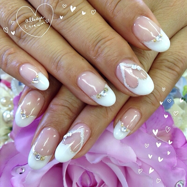 ハート型にくり抜いたネイルの内側にフラワーを描いたラブリーなネイル。ドット柄の逆フレンチと相性バッチリですね!