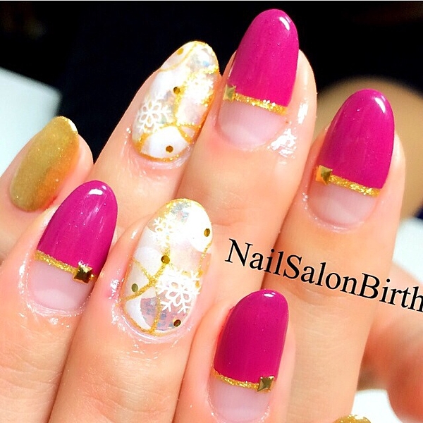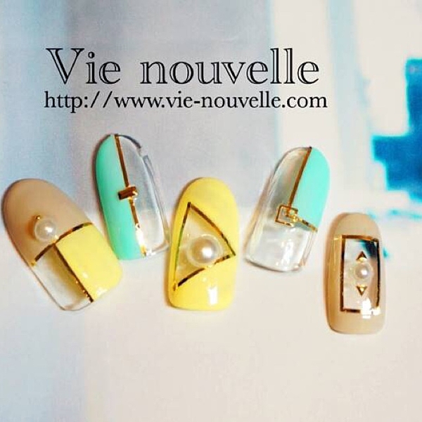 おりがみネイルと三角形のくり抜きネイルの組み合わせ。素材は違くても三角形が同じなのでチグハグしません。