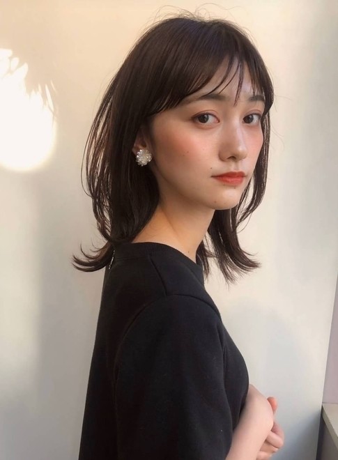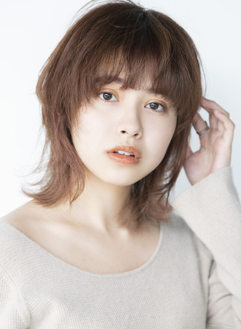 キュッとくびれたフォルムにカットした、大人可愛いウルフミディです。顔周りにおくれ毛カットを施すことで、ニュアンスたっぷりな表情に。前髪はシースルーバングで幼く見えないよう調節しています。