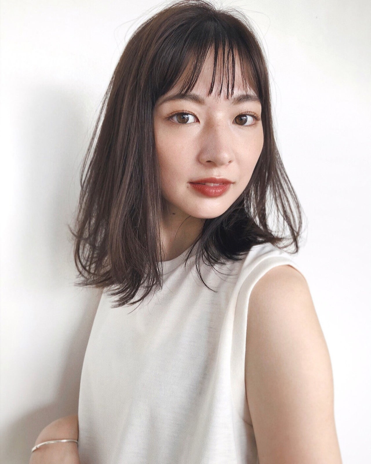 鎖骨ラインでカットするミディアムストレートヘアスタイルは、毛先を遊ばせて毛量を感じさせないヘアスタイルに仕上げています。前髪をオン眉にカットすると、表情が明るく見えます。