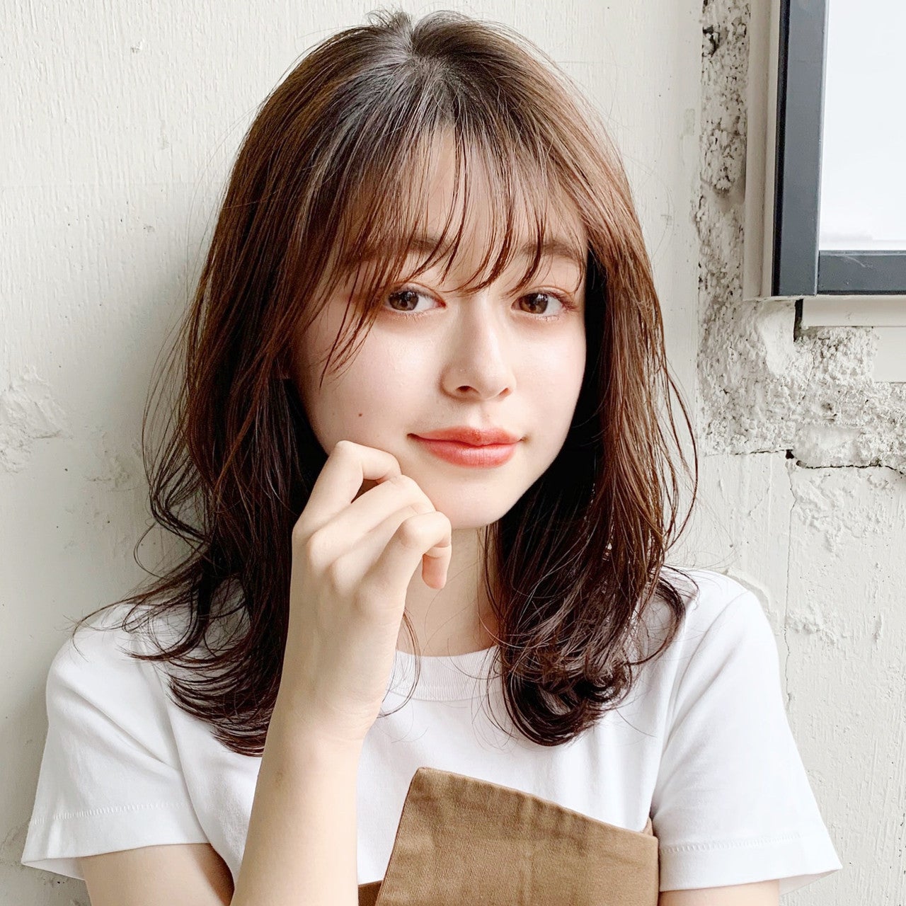 顎ラインから下に、ゆるっとアンニュイなパーマをプラスした、エアリー感抜群のミディアムヘア。前髪をシースルーバングにすることで、ヘアスタイル全体に軽さが出ています。