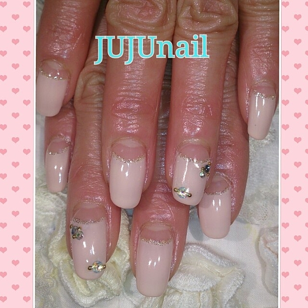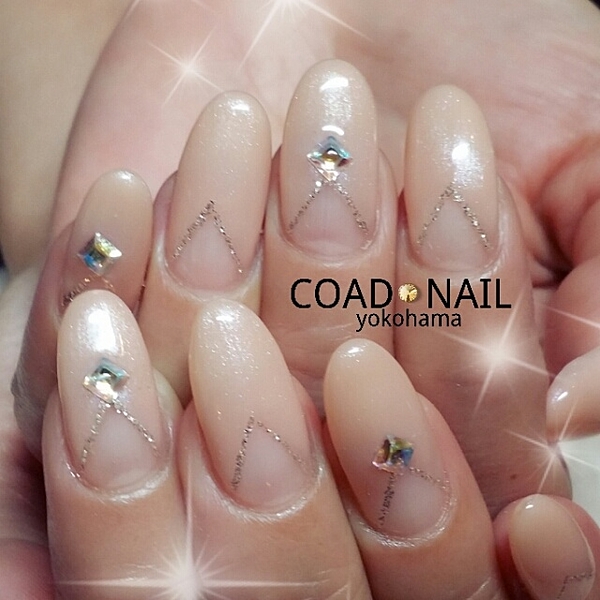 ピンクベージュの逆フレンチにラメラインがシルバー! 可愛いらしいベースに、更に点ドットをアート♡ 可愛い女の子って感じですねっ( *´艸`)♪ http://t.co/cRJpi5U8aS #ネイル #キレイ #モテ