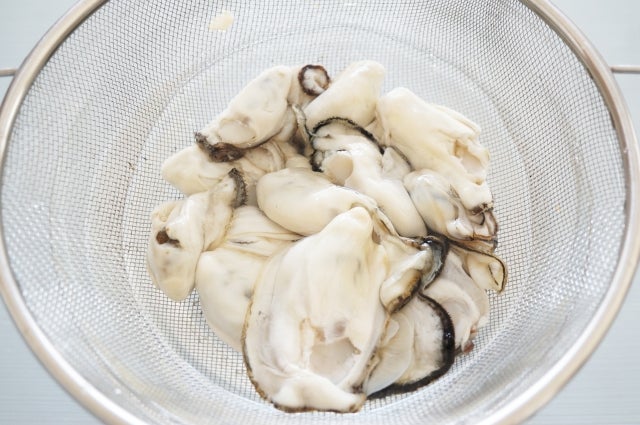 生カキはザルに入れ、塩水につけながら振り洗いし、水気をしっかり拭き取る。