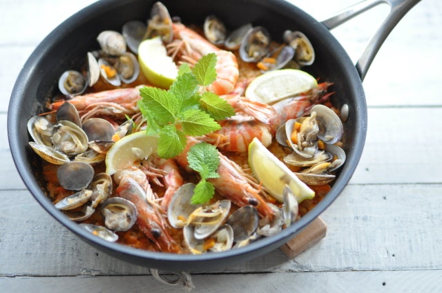 フライパンのまま熱々をサーブできる、我が家で人気のパエリア。簡単でおいしいって主婦にとってはありがたいメニューですよね。