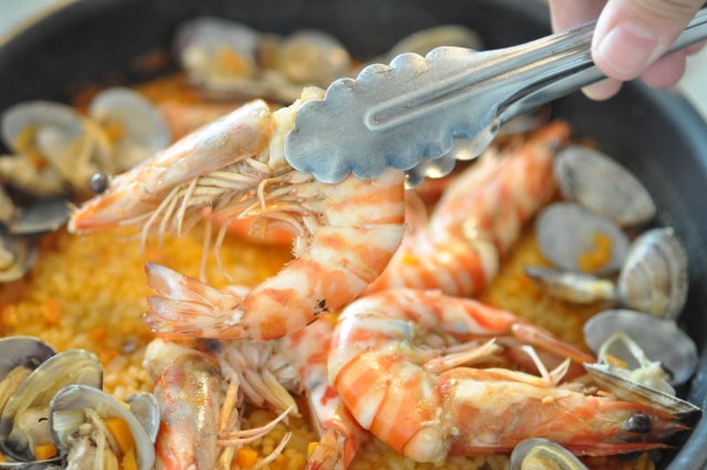② 水、サフランを加え、あさりと海老を加えて蓋をします。あさりの口が開き、海老の色が変わったら取り出します。この時、有頭海老の場合は頭を押して旨みをスープに移します。