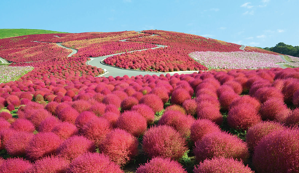 秋が訪れると真っ赤に染まる丘、