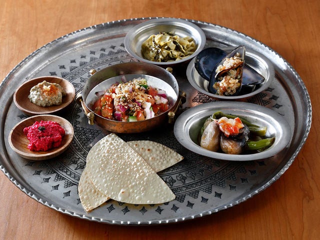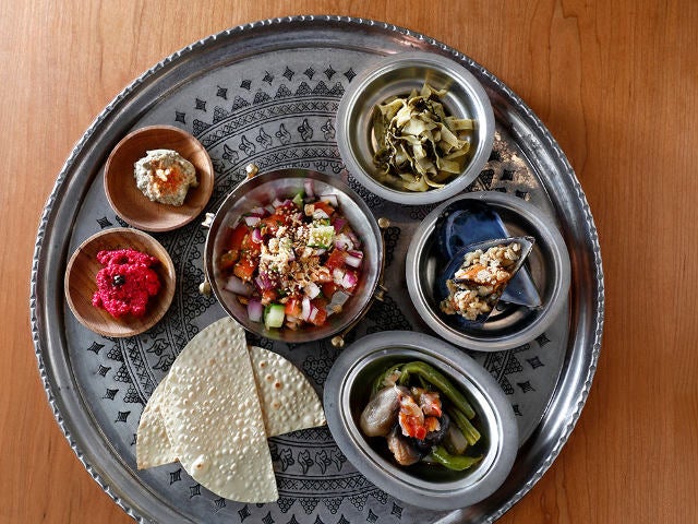 内容はその時々で変わるが、この日は、左から時計回りに「ビーツとヨーグルトのディップ」、「茄子のディップ」、「オリエンタルサラダ」、「インゲンと袋茸のオリーブ油煮」、「ムール貝のチウラ詰め」、「発酵茶葉ラペソーと押し豆腐の和え」。
