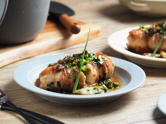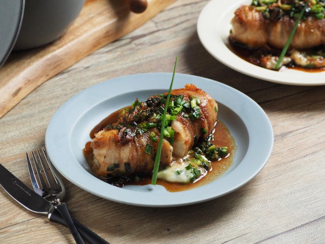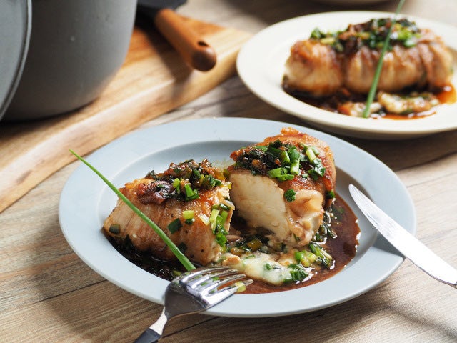 ⑨ 皿に盛り、フライパンのソースを上からかけて、出来上がり。お好みで、10cmくらいの細ねぎを飾ります。小口切りにする前に、2本ほど残しておくと飾りに使えますよ!