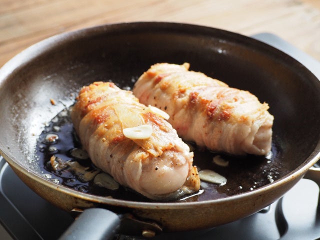 ⑥ フライパンにオリーブオイルをひき、火を点けたら⑤を肉の巻き終わりを下にして入れる。