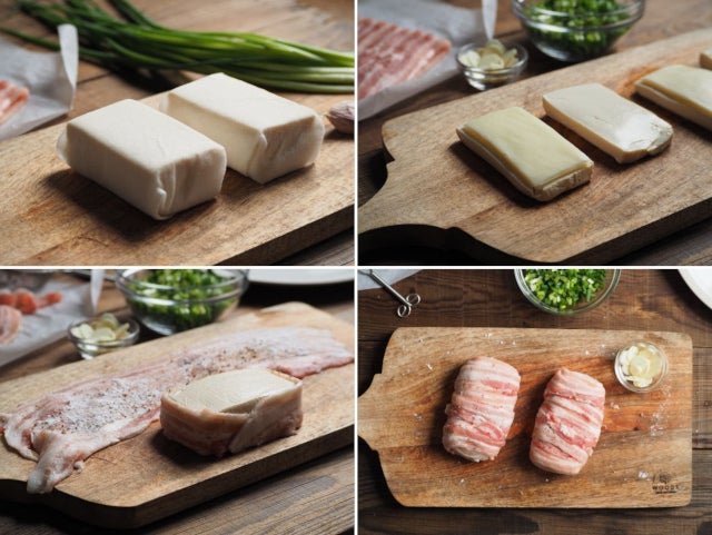 ⑤ 豆腐に豚バラ肉を一枚ずつ巻きつけていき、全体を覆う。(縦と横方向に巻き付けていくと、隙間なく覆えます。側面に巻いたら、あとは垂直方向に巻いていきます。)