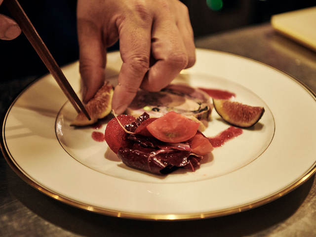 うまみを吸ったピスタチオはインゲンのような食感で、2種のキノコと豚のミンチが食感にアクセントをプラス。とろける食感で甘美な甘さの黒イチジクや、酸味のあるビーツのヴィネグレット(冷たいソースの一種)といただくことで、より一層鴨のうまみが際立つ。