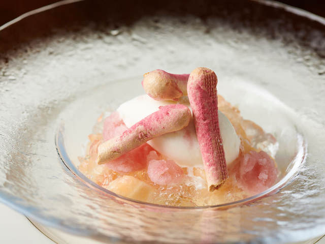 桃リキュールとフレッシュな桃の香りが芳(かぐわ)しく、トロッととろけるジューシーな桃にひんやりシャリシャリ食感のグラニテやすっきりとした味わいのヨーグルトのソルベが爽やか。サクサク食感で甘酸っぱいフランボワーズのメレンゲを、溶けてきたソルベにつけてもおいしい。