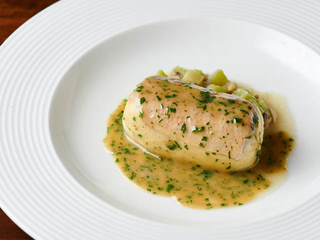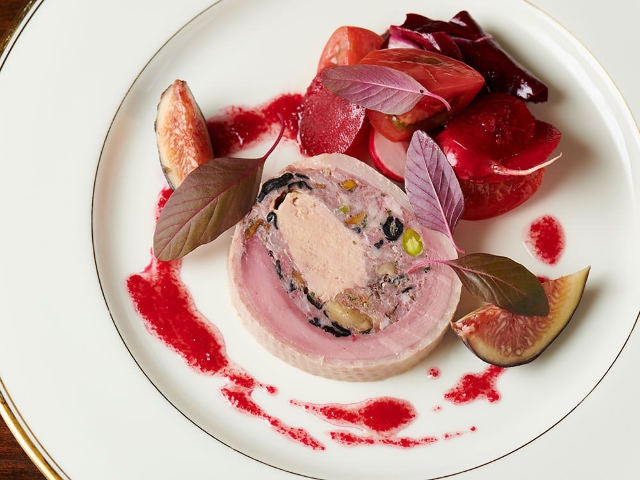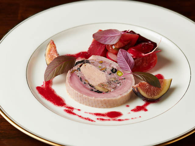 クロワゼ鴨を背中から開き、縦方向に内側へ巻くことで、一つの断面に胸肉とモモ肉を共存させている。中には内臓ミンチにフォワグラ、豚の挽肉ミンチにフランス産のトランペット茸とジロール茸、ピスタチオを入れ、低温で茹で冷菜に仕上げる。