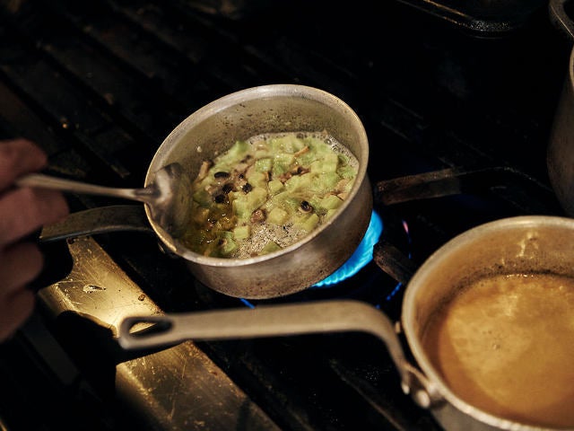 これにバターを加え仕上げたものがソースヴェルモットとなるが、ワインの酸味によるキレを出し、より香りを際立たせるため提供直前にもう一度ヴェルモット酒を煮詰め、まだ暑さの残る季節ということで仕上げにフレッシュなハーブを加えた。その結果、清涼感あふれるハーブの香りに酸味が爽やかなソースに仕上がる。