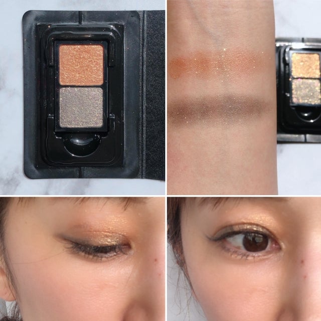 パウダーはしっとりしていて薄付きですが、重ねると写真のようにしっかり色も出ます。パールの側はニュアンス程度の色付きで、チラチラ繊細に輝くグリッターが上品で可愛いです。