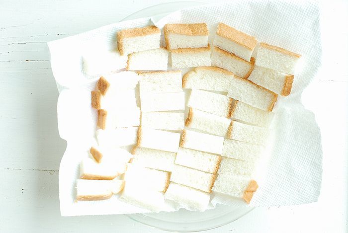 ② 耐熱容器にキッチンペーパーを敷いてカットした食パンをのせレンジ500wで2分加熱する。反対に返してさらに2分加熱して水分を飛ばす。