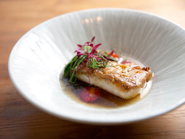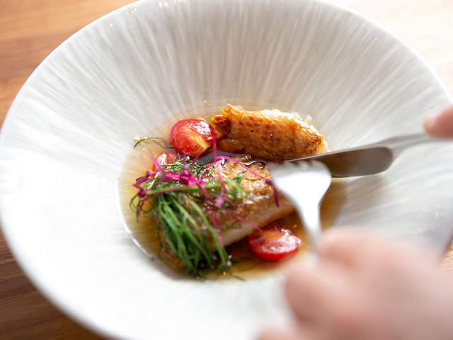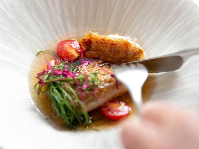 甘鯛のウロコを少し水に湿らせてから多めの油で焼くことで、身はふっくら、ウロコがパリパリに。この甘鯛に、牛から取った黄金色に澄んだコンソメスープを合わせている。