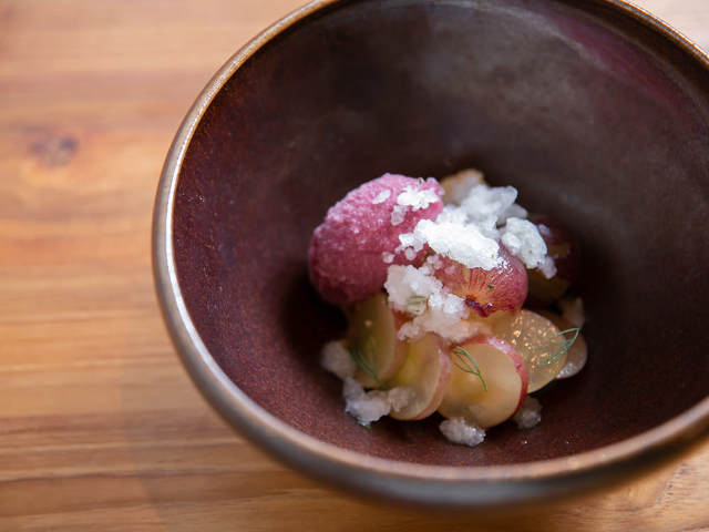 ブドウは藤稔(ふじみのり)と巨峰、クイーンニーナの3種類。ディルのグラニテを散らし、ハーブの爽快感のある香りで、甘いだけではない大人のデザートに仕上げている。