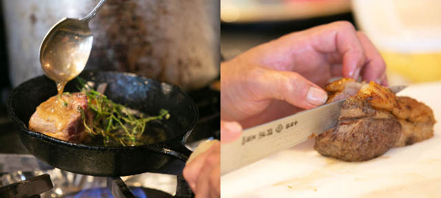 表面を強火でカリッと焼き付けて、皮の周辺部分は少し噛みごたえを残し、中心部分はやわらかく仕上げていく。火から降ろしたら、焼いた時間と同じ時間休ませ、中の肉汁を落ち着かせることで味わいがジューシーになる。