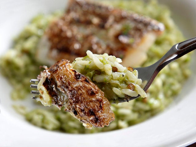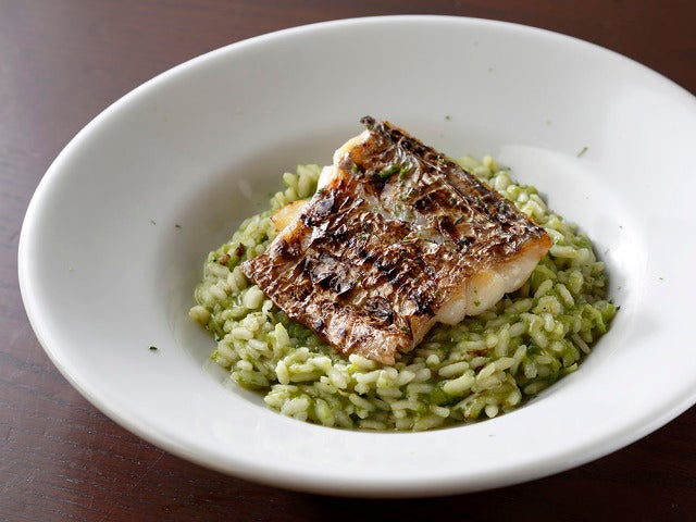 野菜の青くささがやみつきになるリゾットは、炭火焼した太刀魚と相性抜群