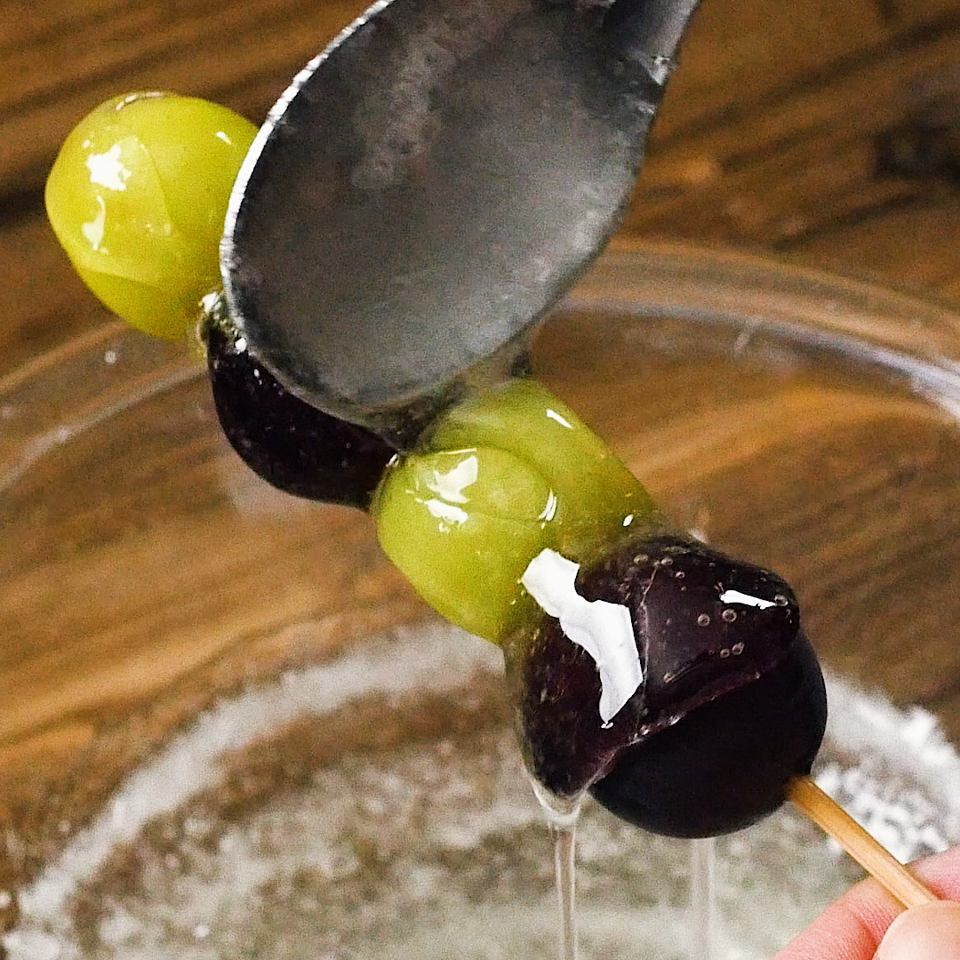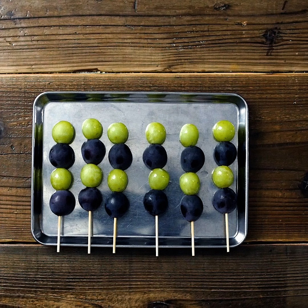 ぶとうとマスカットを交互に4粒ずつつ、串に挿します。