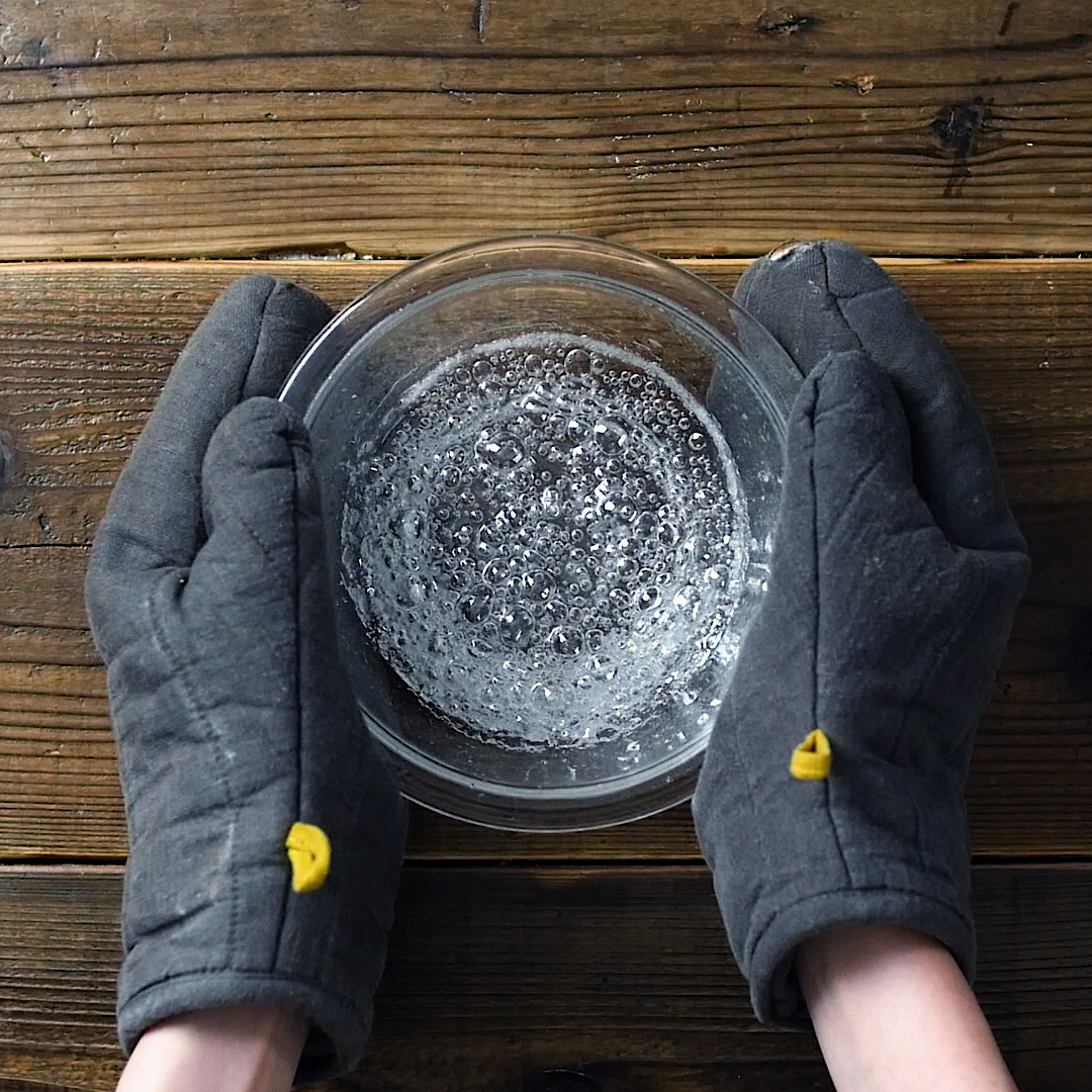 耐熱容器にグラニュー糖、水を加えて、軽く混ぜ、レンジ600Wで6分30秒加熱します。