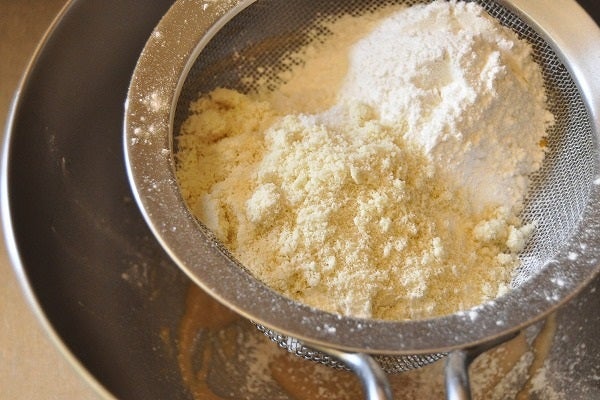 1、大きめのボウルで<A>の材料を混ぜ合わせ、薄力粉とアーモンドプードルを振るいながら加える。